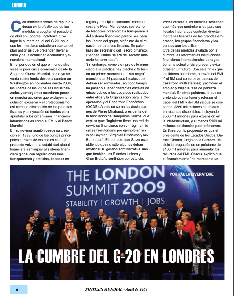 En el 2009 y hasta el 2013 colaboré con artículos de carácter internacional para la revista Síntesis Mundial de la ONG Fundamentar. Dos de mis artículos aquí debajo: