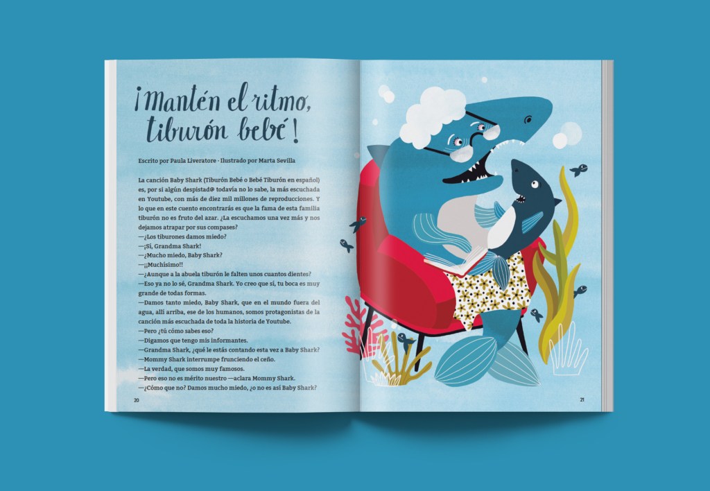 La canción Baby Shark (Tiburón Bebé o Bebé Tiburón en español) es, por si algún despistad@ todavía no lo sabe, la más escuchada en Youtube, con más de diez mil millones de reproducciones. Y lo que en este cuento encontrarás es que la fama de esta familia tiburón no es fruto del azar. ¿La “escuchamos” una vez más y nos dejamos atrapar por sus compases?
