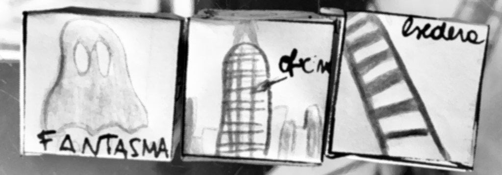 Les comparto un texto que surgió de la formación «Técnicas narrativas para libros infantiles» a cargo de Natalia Méndez en Domestika. Como se darán cuenta por la imagen, tuvimos que confeccionar tres dados y a partir de ahí escribir gracias al «azar». Así que este cuento se trata de un fantasma que se llama Akio y ya no les digo más 🙂